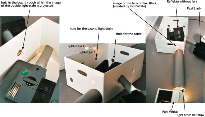 Projection 2002 1 bananabox, white painted 1 shoebox, white painted 3 sanitary pipes 3 slide projectors 2 slides 2 cables to be watched at daylight!