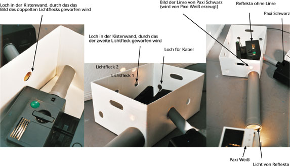 Projektion Reflekta im Spiegel Der Letzte macht das Licht aus Projektion 2002 ca. 120x80x30 cm 1 Bananenkiste, weiß gestrichen 1 Schukarton, weiß gestrichen 3 Sanitärrohre 3 Diaprojektoren 2 Dias 2 Kabel zu betrachten bei Tageslicht! Paximat 2000 (weiß): Vorderansicht Paximat international Paximat international (schwarz): 2 Lichtflecken Relekta AF_1800: Licht