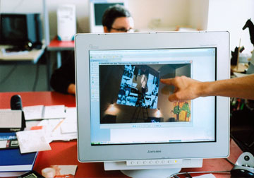 Nikolai Olenikov, artist and radiospeaker with sense of mission shows his work on Julia Abramova's computer