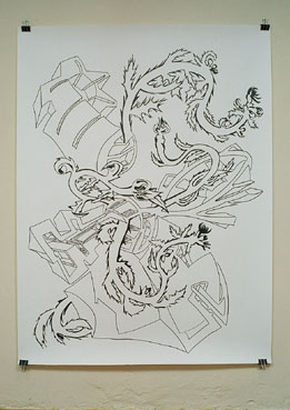 Jörn Gerstenbergs Zeichnungen beschäftigen sich mit Architektur-Phantasien, die in ornamentalen Bildgrenzen organisiert sind. Die Standtlandschaften reagieren auf ihre Eingrenzung. Räumlichkeit gerinnt zur Oberflächenstruktur und Oberfläche öffnet sich in labyrinthische Räume.
