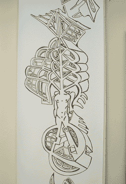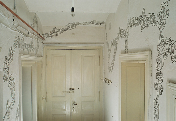 Begleitet werden diese Zeichnungen auf Papier von einem stilisierten Figuren-Set als Wandarbeit. Diese Wesen vereinen organische Formen (menschliche Torsi) mit ornamentalen Ergänzungen. Sie spielen an auf Fabelwesen wie Alraune, Sphinx und Minotauros . Die Ornament-Gliedmaßen finden sich als Bildgrenze in den Stadtlandschaften wieder. Es treten auch Figuren auf, deren Innenleben sich bei näherer Betrachtung als Hochhaus-Stadt erweist.