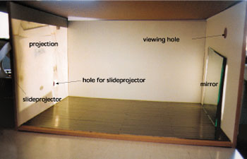 The viewer is mirrored by a projector with an upright slidemagazine, behaving