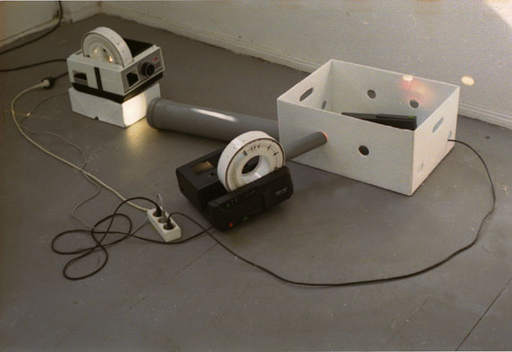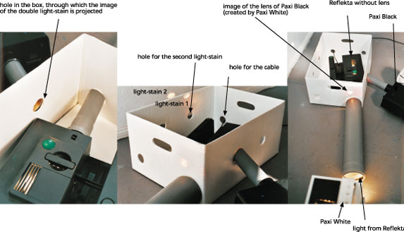 Projection Reflekta in the mirror The last one turns off the lights Projection 2002 1 bananabox, white painted 1 shoebox, white painted 3 sanitary pipes 3 slide projectors 2 slides 2 cables to be watched at daylight! shown is: Paximat 2000 (white): front Paximat international Paximat international (black): 2 light-stains Relekta AF_1800: light