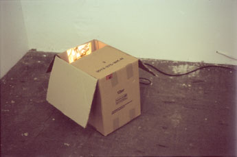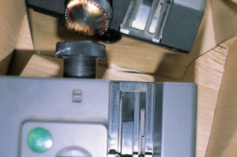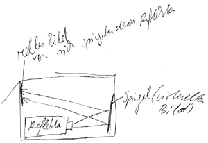 Hidden in the box slide projector Reflekta stands in front of a mirror. The picture it produces is, via the mirror, projected onto the opposite side of the box. the slide shows Reflekta standing in the box in front of the mirror. |